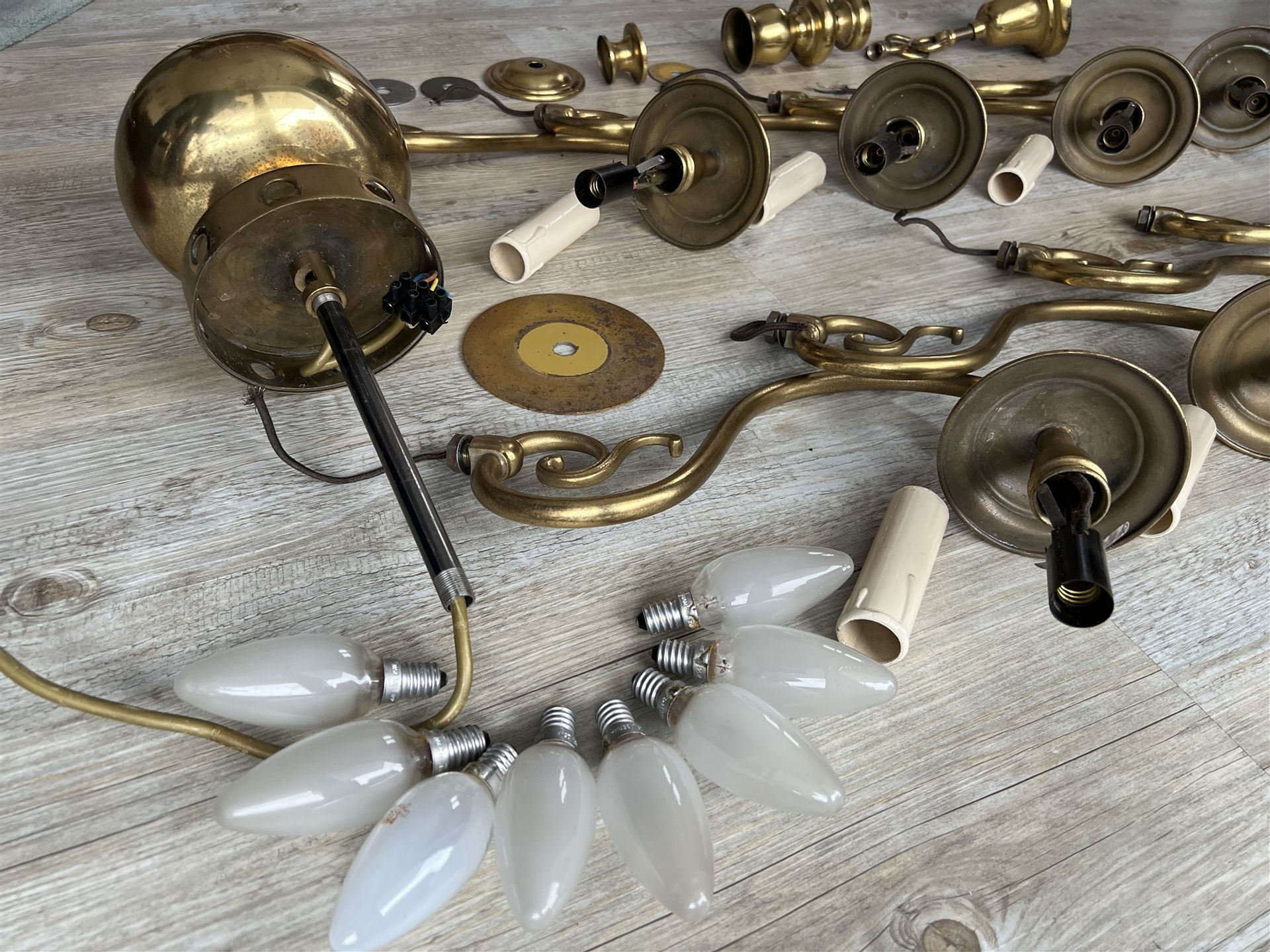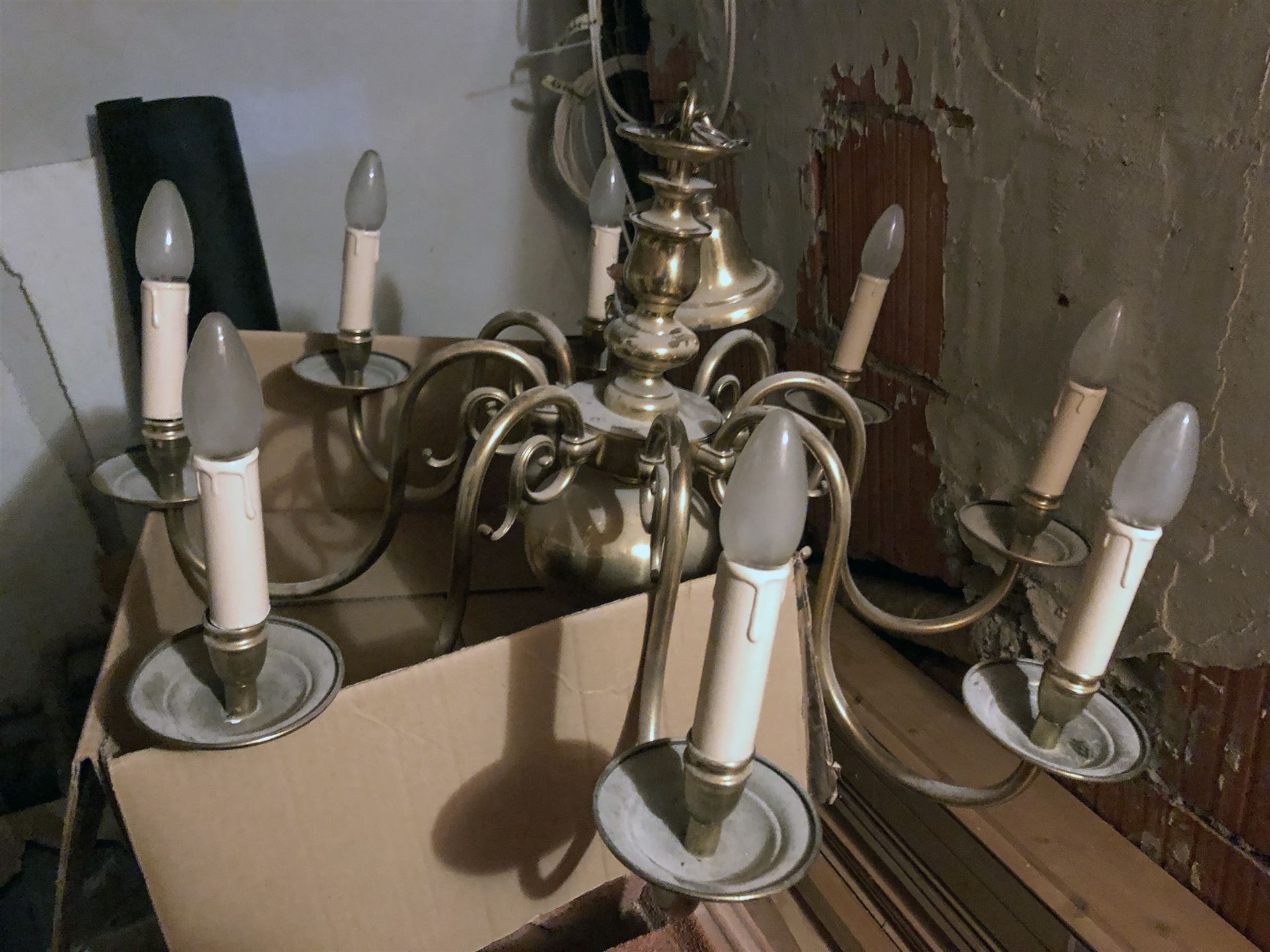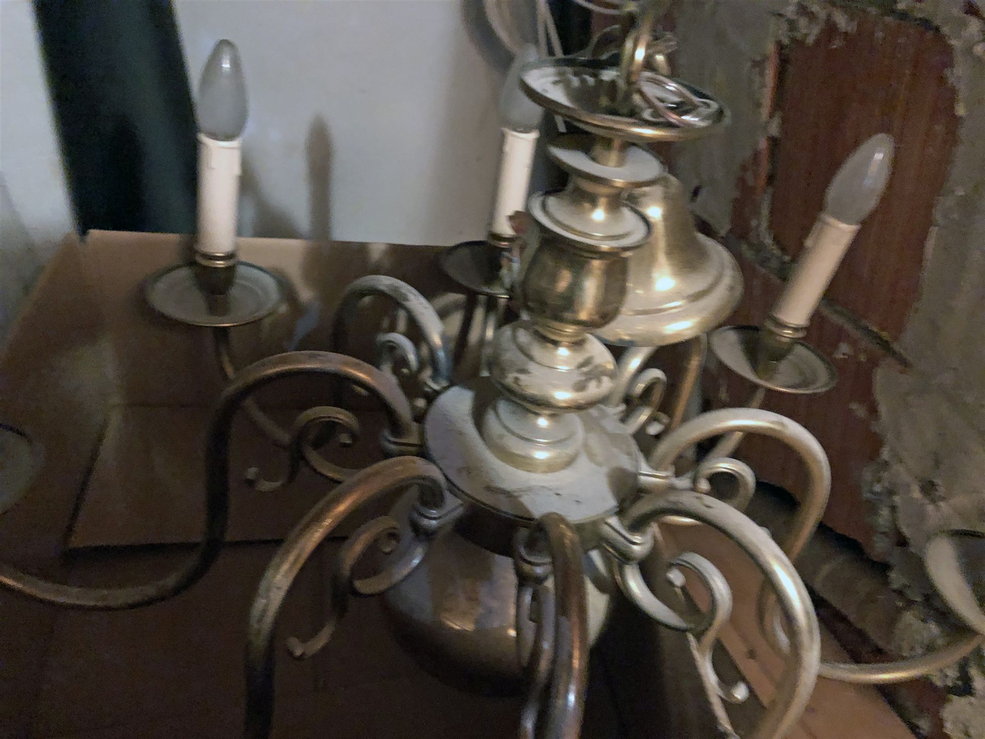 Der Leuchter ist zerlegt und kann somit verschickt werden. Ein Kabel zur Glühbirne ist herausgezogen und muss wieder eingezogen werden. Der Zustand ist gut, gebrauchsspuren sind aber vorhanden. Bei Interesse schreibt uns im Formular unter den Fotos.
