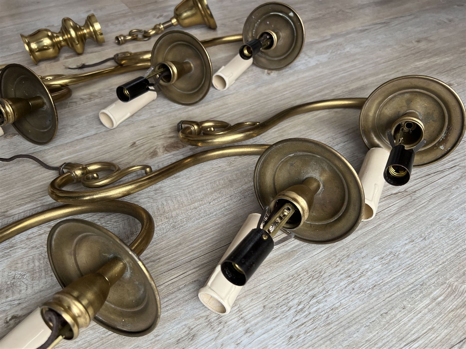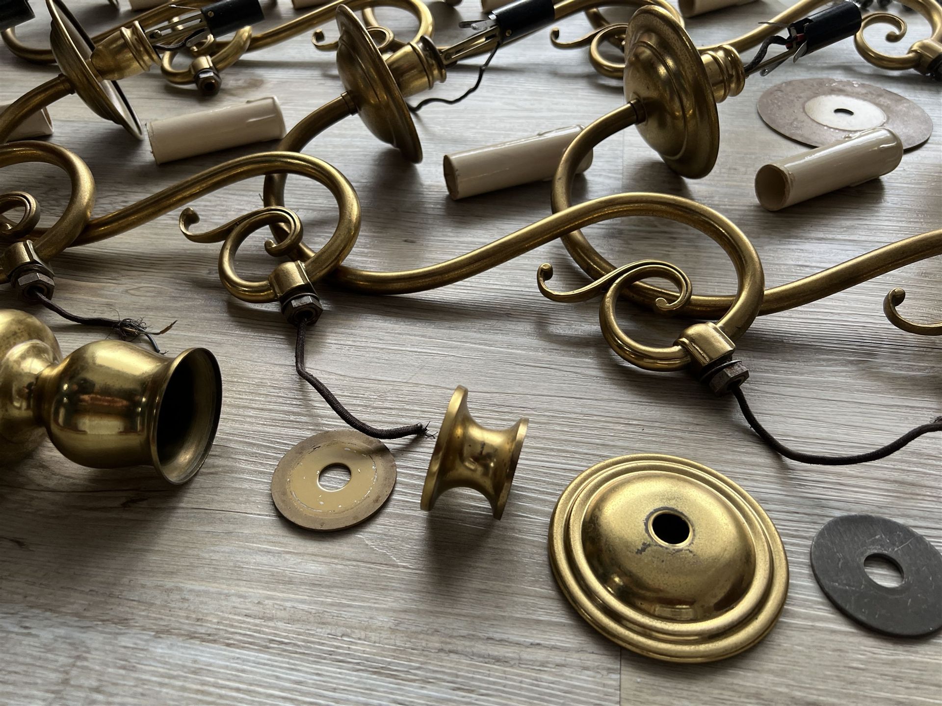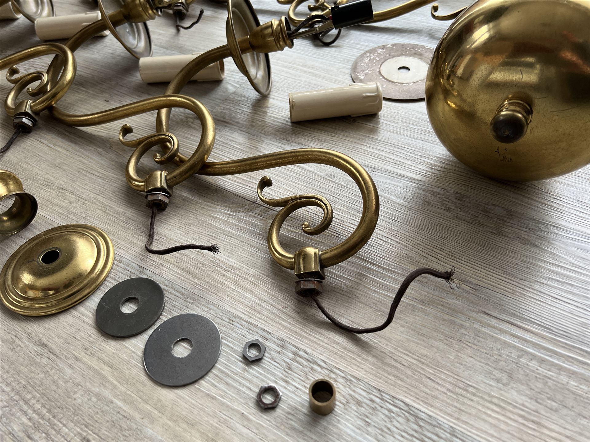Der Leuchter ist zerlegt und kann somit verschickt werden. Ein Kabel zur Glühbirne ist herausgezogen und muss wieder eingezogen werden. Der Zustand ist gut, gebrauchsspuren sind aber vorhanden. Bei Interesse schreibt uns im Formular unter den Fotos.