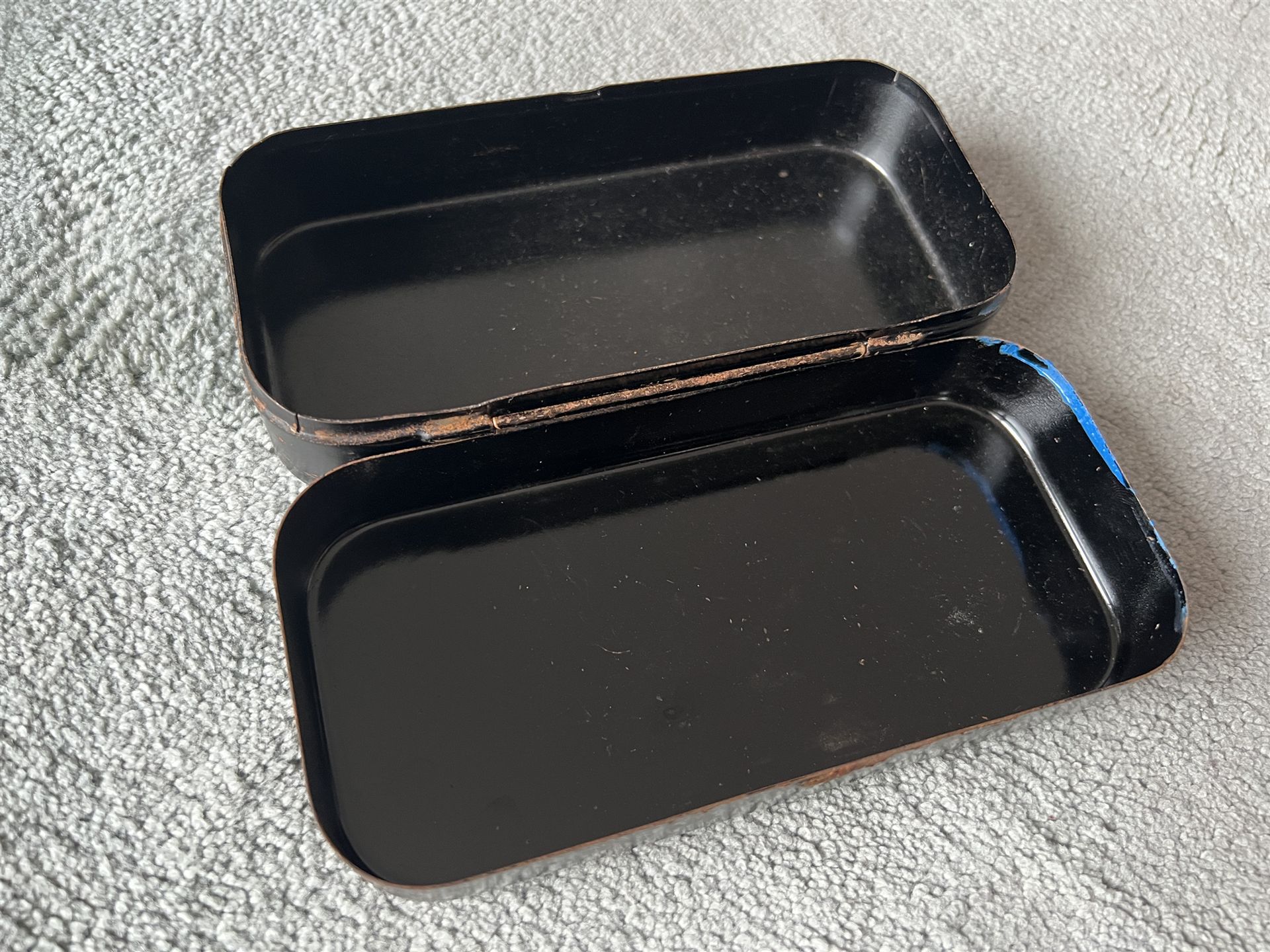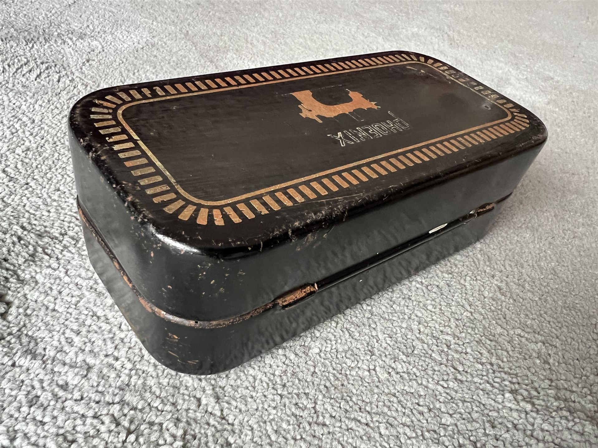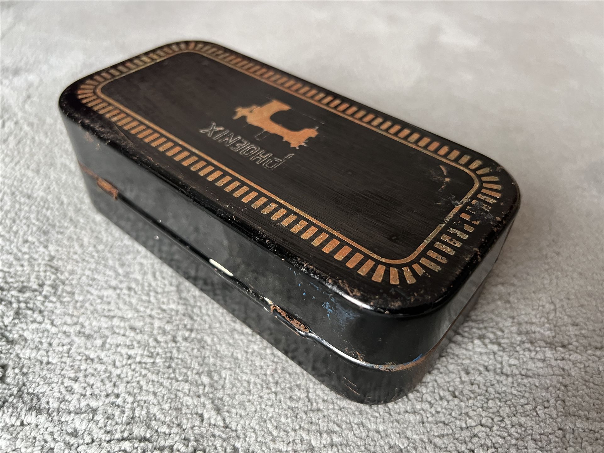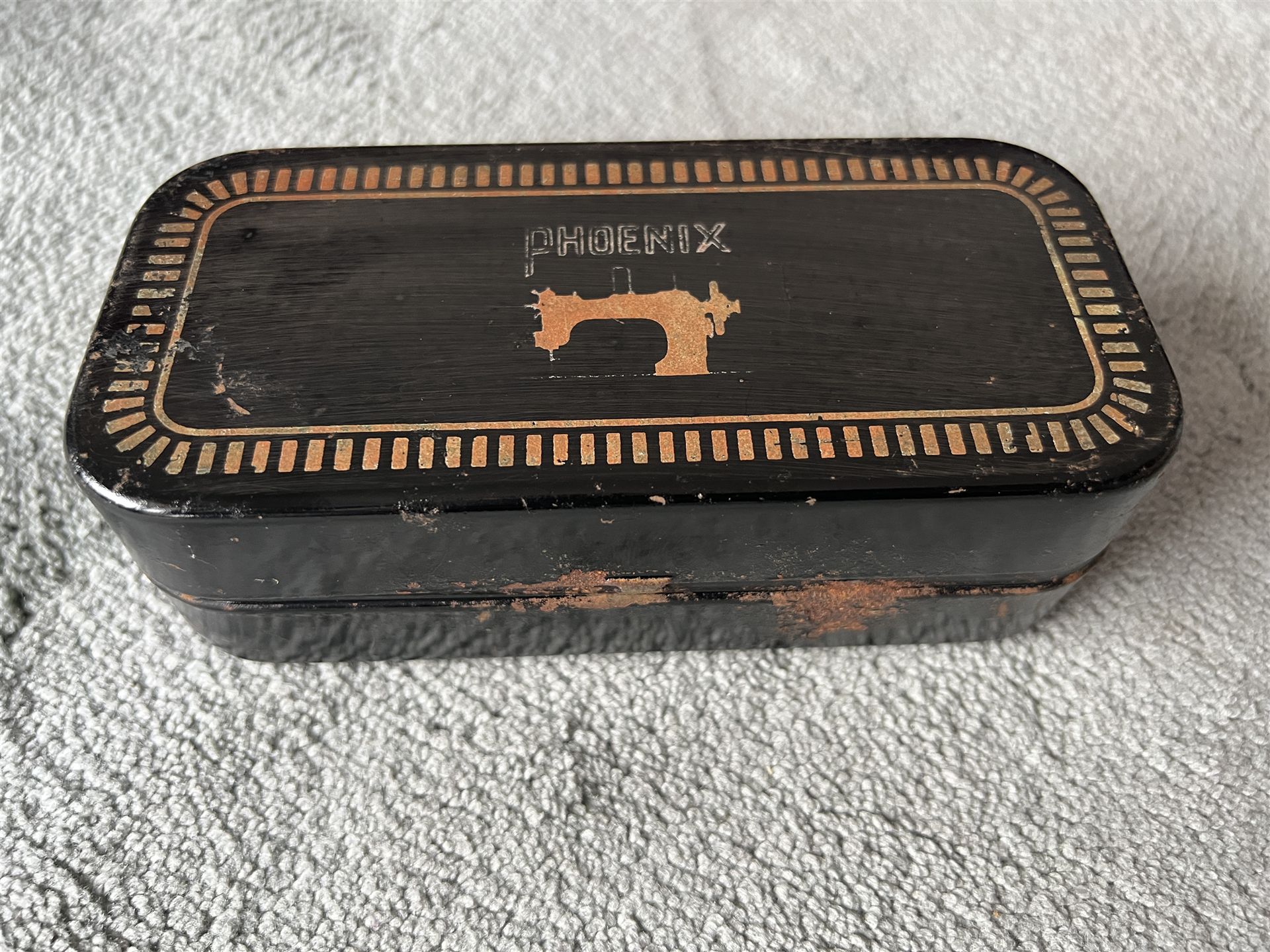 Ich biete eine alte Blechdose für eine Phoenix Nähmaschine an.